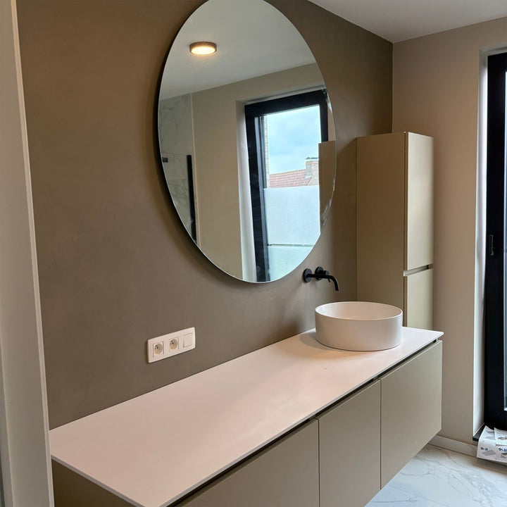 Eine Betonoberfläche ist recht porös. Dies bedeutet, dass die Oberfläche nicht vollständig wasserfest ist und sich auch Schmutz und Fettreste ansammeln können. Wenn du eine Betonoberfläche vollständig wasserdicht und pflegeleicht machen möchtest, verwende unsere Beton Cire versiegelung. Es verschließt die Poren im Beton und legt eine Schutzschicht über den Beton. Dadurch kannst du es leicht sauber halten. Abwischen und Abwaschen ist kein Problem. In Bereichen, die zusätzlichen Schutz benötigen (wie eine Dusche oder der Boden), empfehlen wir 2 Deckschichten, um deine Beton Cire zu schützen.